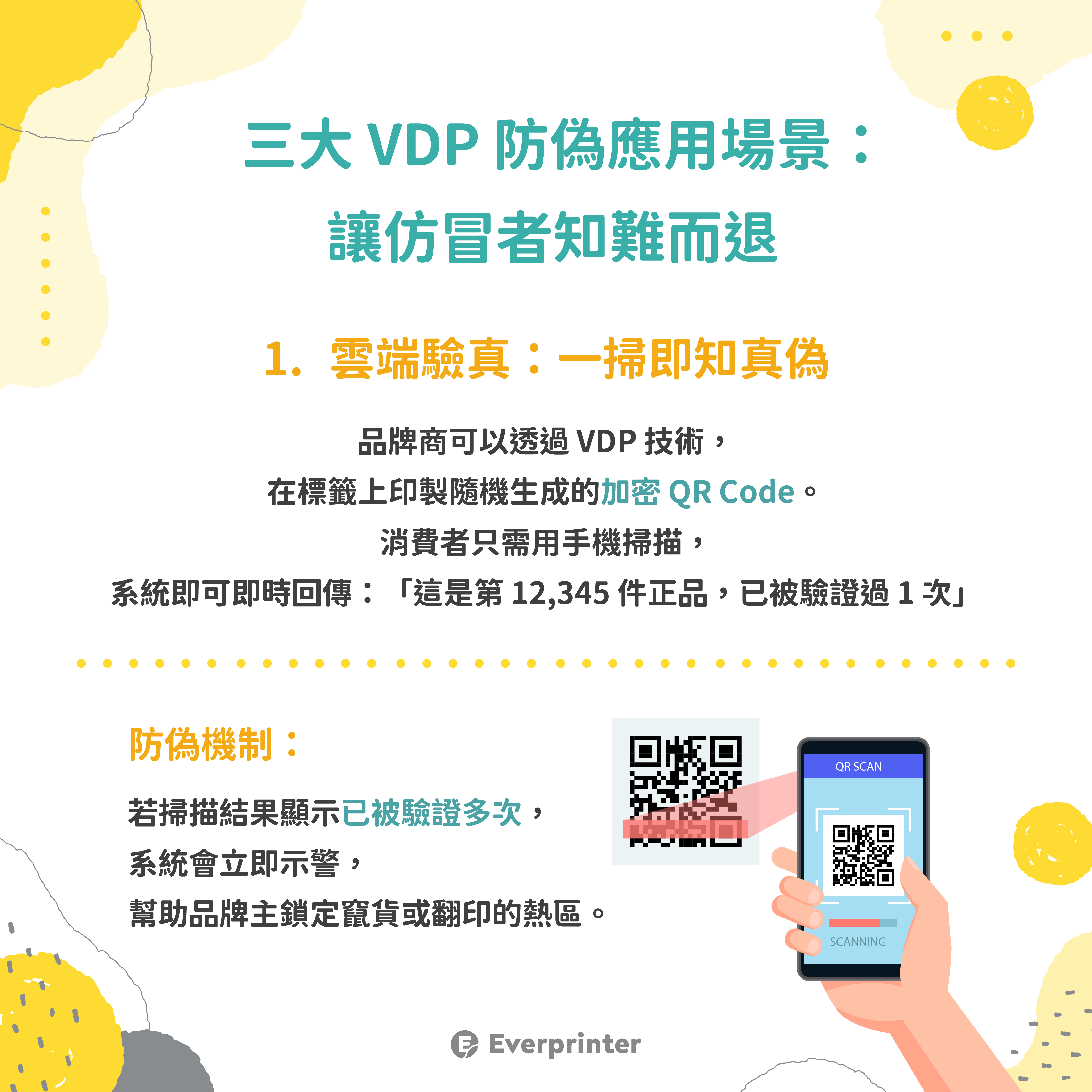 品牌商可以透過 VDP 技術,在標籤上印製隨機生成的加密 QR Code。消費者只需用手機掃描,系統即可即時回傳:「這是第 12,345 件正品,已被驗證過 1 次」。