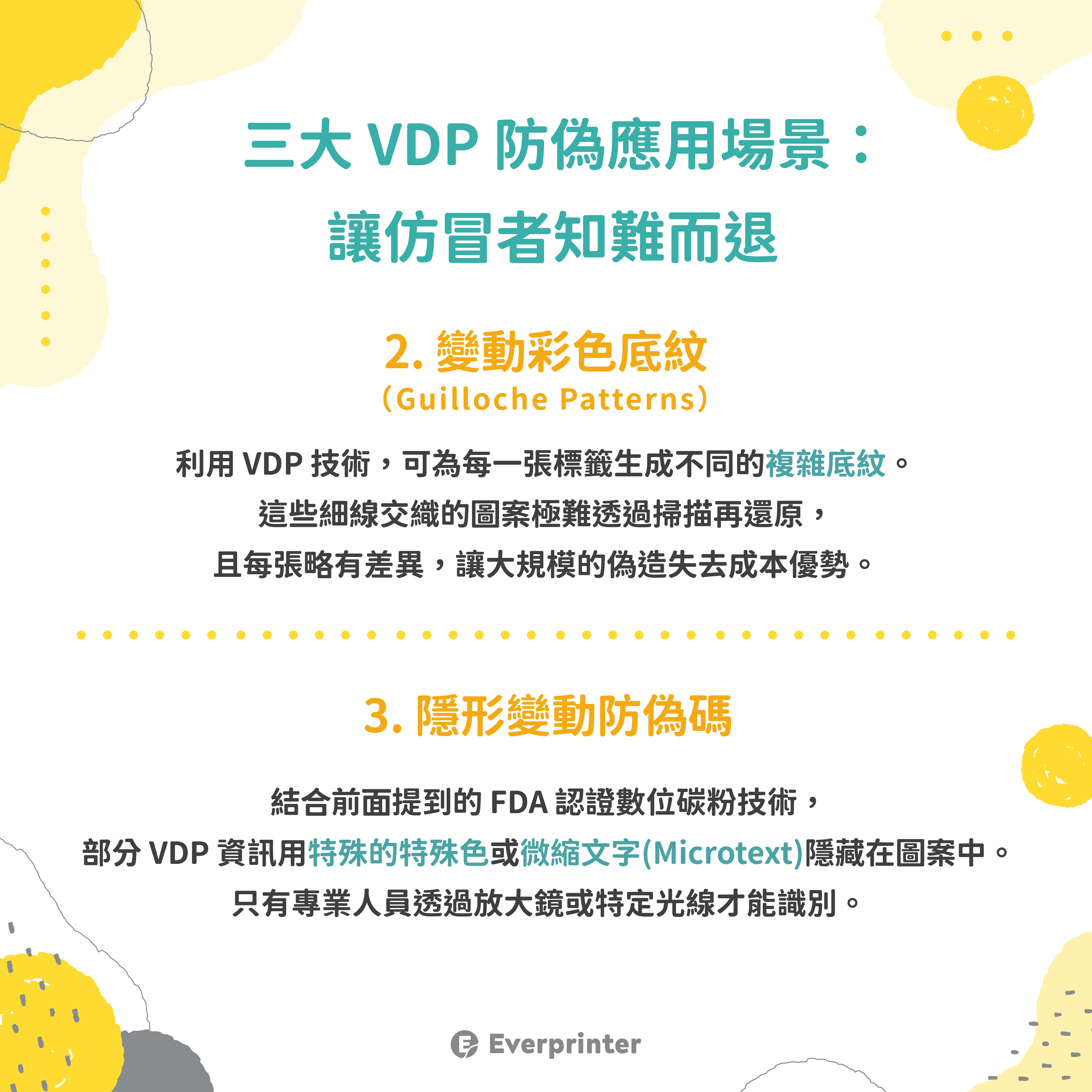 結合我們前面提到的 FDA 認證數位碳粉技術,部分 VDP 資訊甚至可以用特殊的特殊色或微縮文字(Microtext)隱藏在圖案中。只有專業人員透過放大鏡或特定光線才能識別。