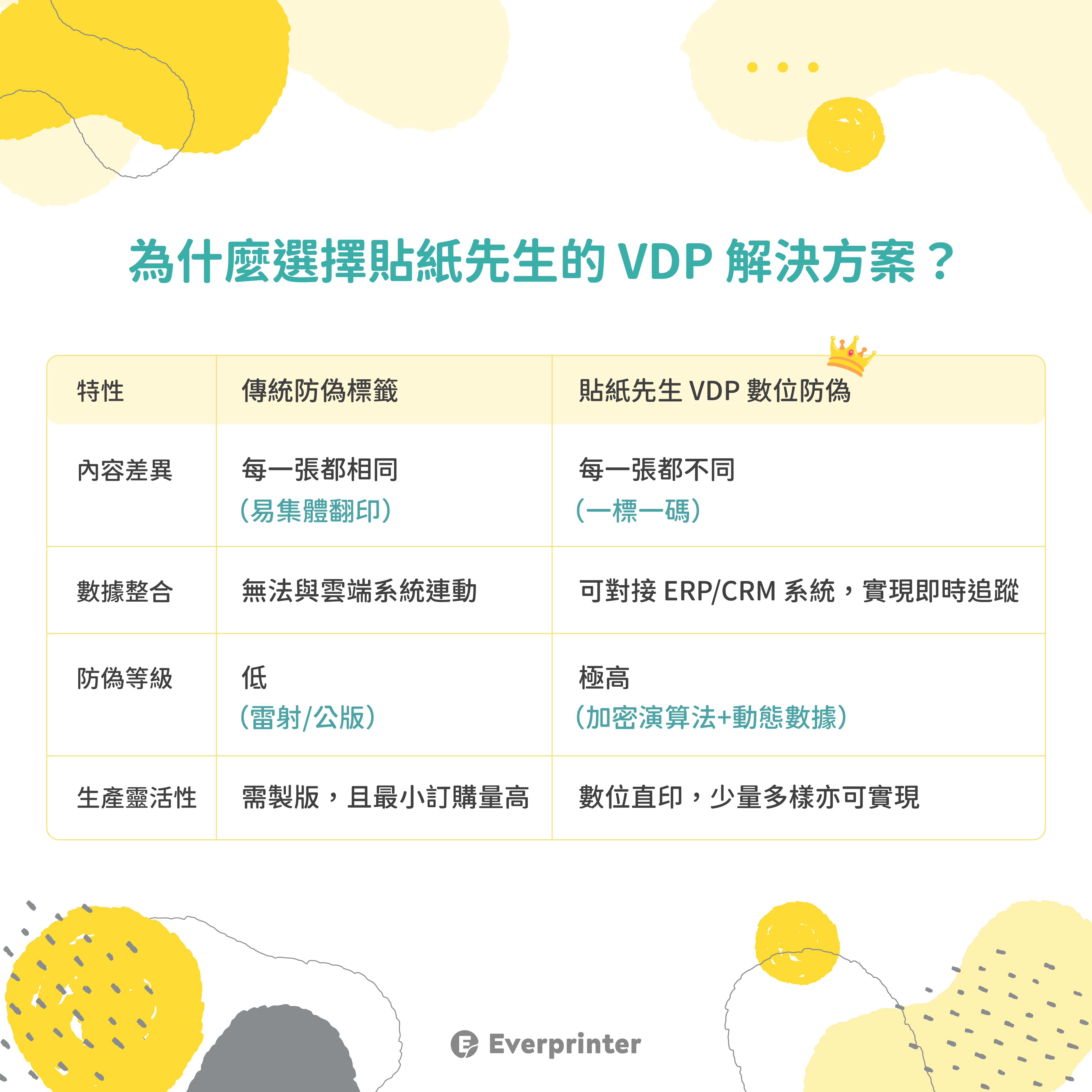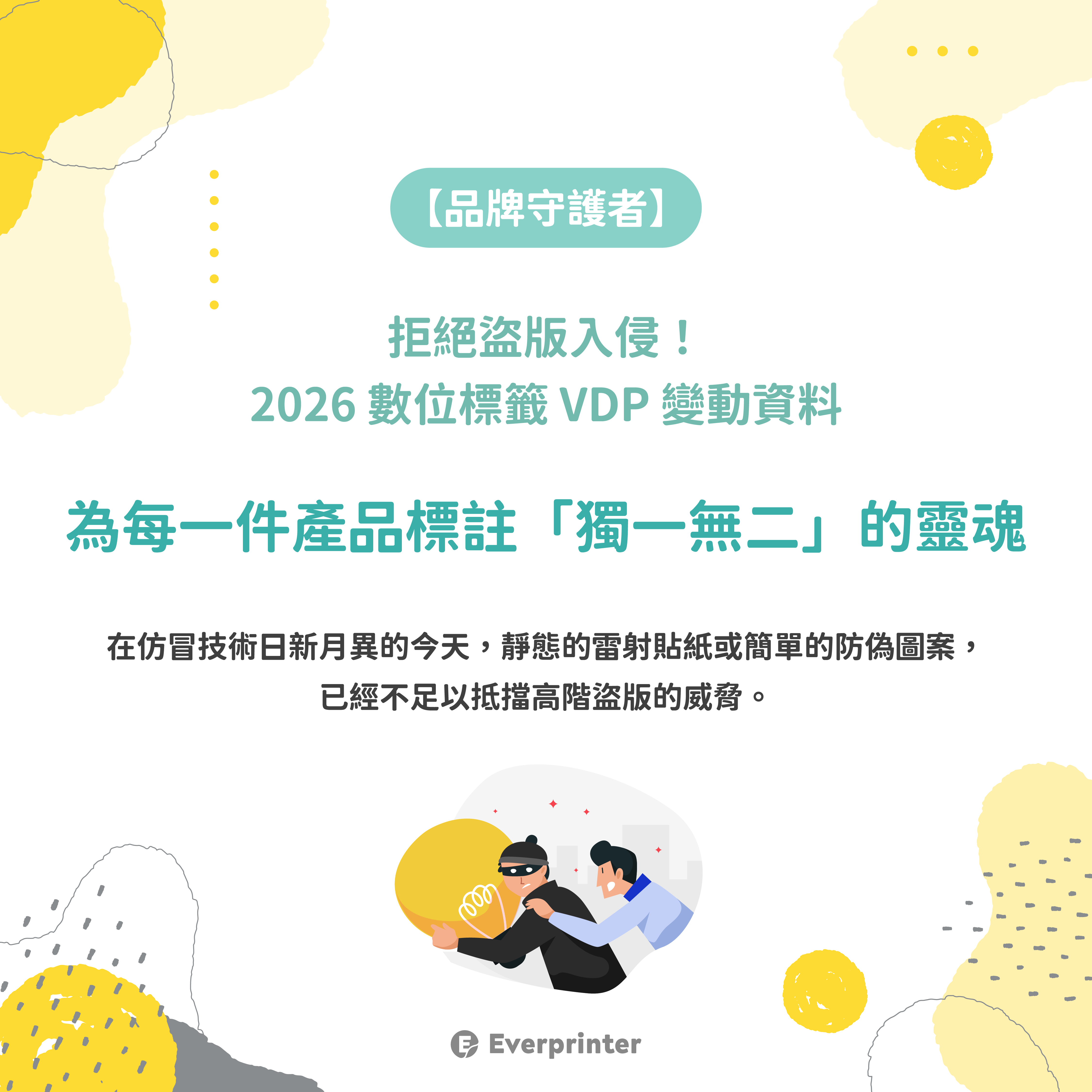 作為台灣數位標籤的先行者,貼紙先生 Everprinter 觀察到:2026 年品牌防偽的核心在於 VDP (Variable Data Printing,變動資料印刷)。這是一項結合數位印刷與大數據的技術,讓標籤從「裝飾品」進化為「數位警察」。