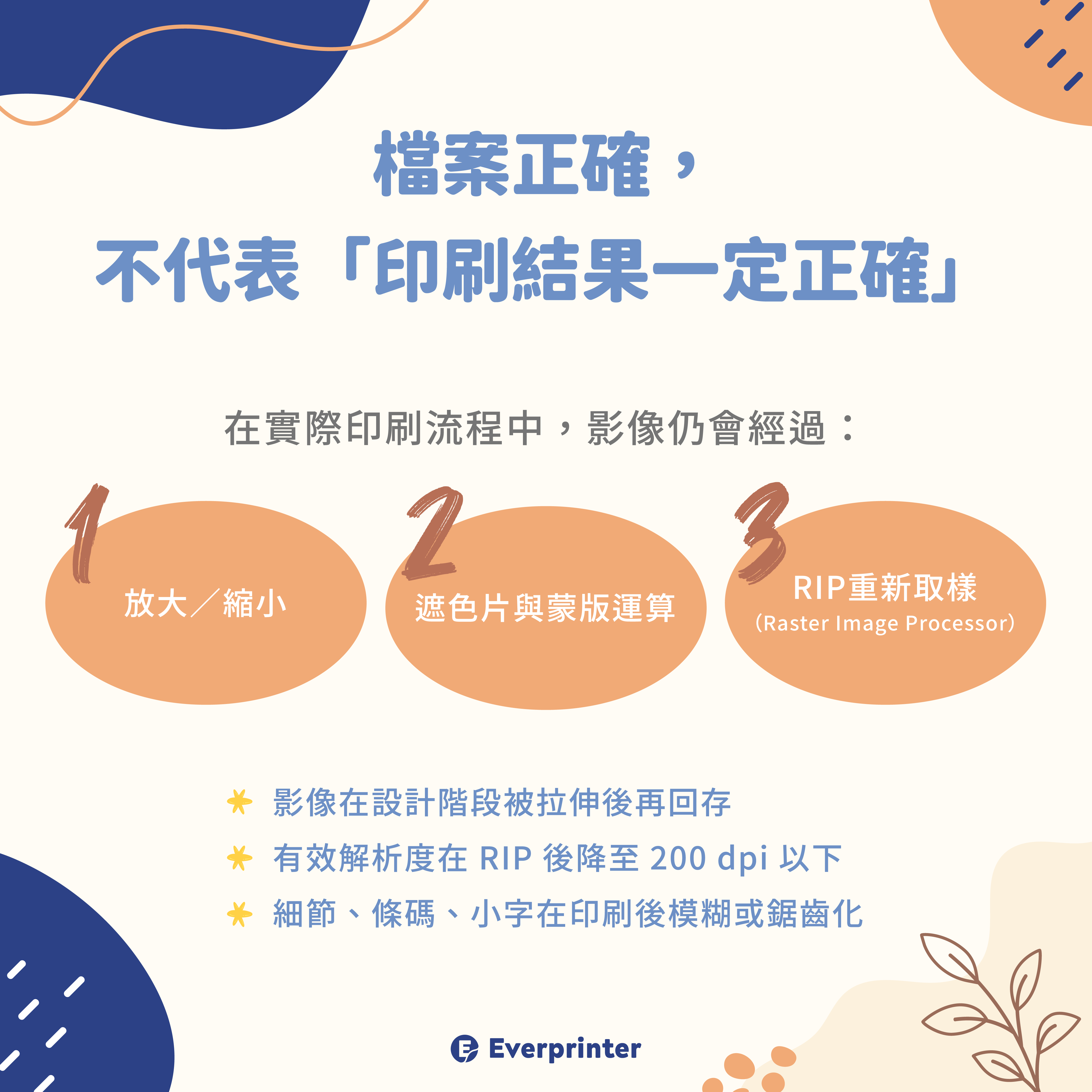 設計檔案標示 300dpi,並不代表最終印刷就能呈現 300dpi的細節。在實際流程中,影像會經過放大縮小、遮色片運算以及 RIP(Raster Image Processor) 重新取樣。