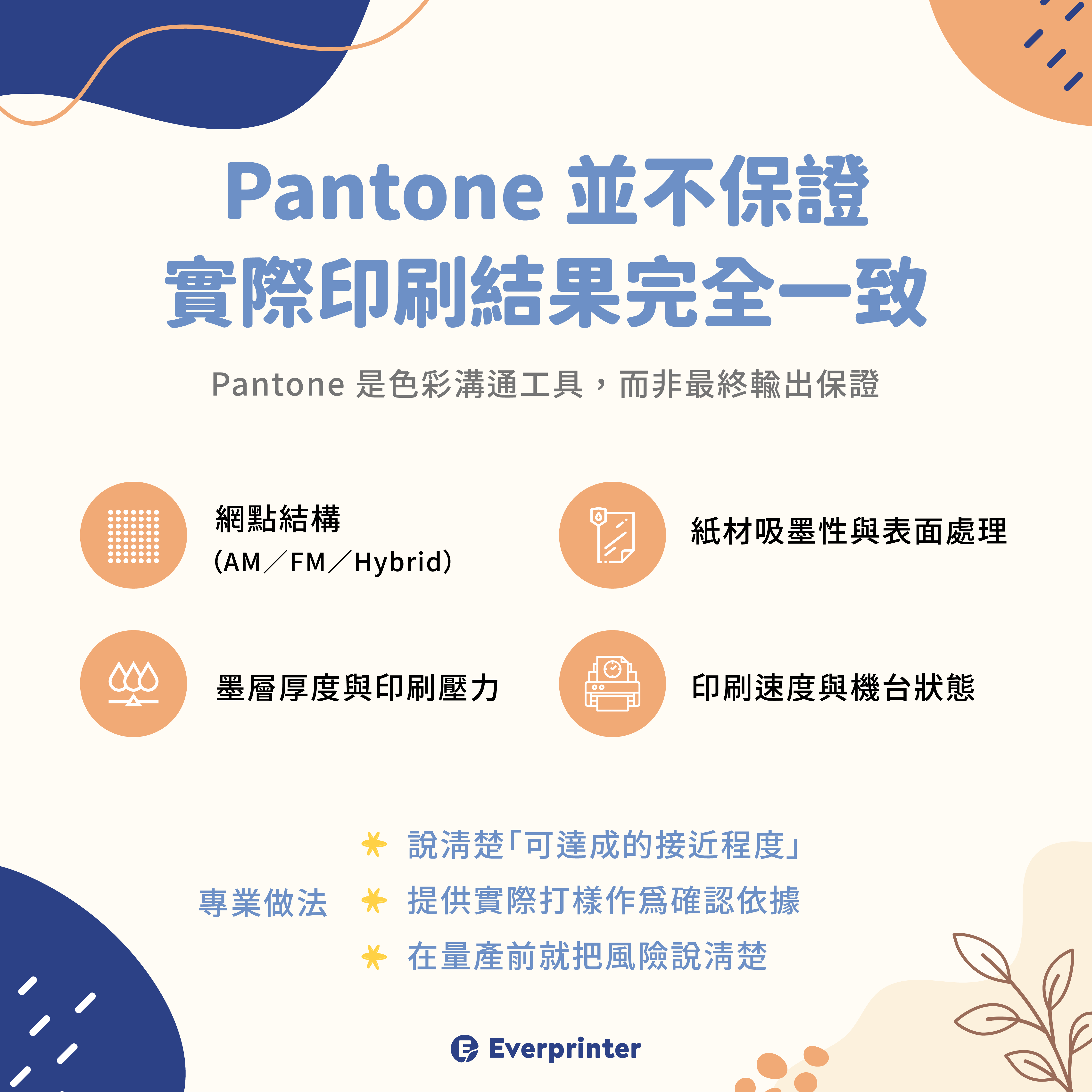 Pantone 是溝通工具,而非最終保證。實際效果會受網點結構、墨層厚度與紙材吸墨性影響。Everprinter 的做法是在量產前,主動說明「可達成的接近程度」,並提供實際打樣作為確認依據。