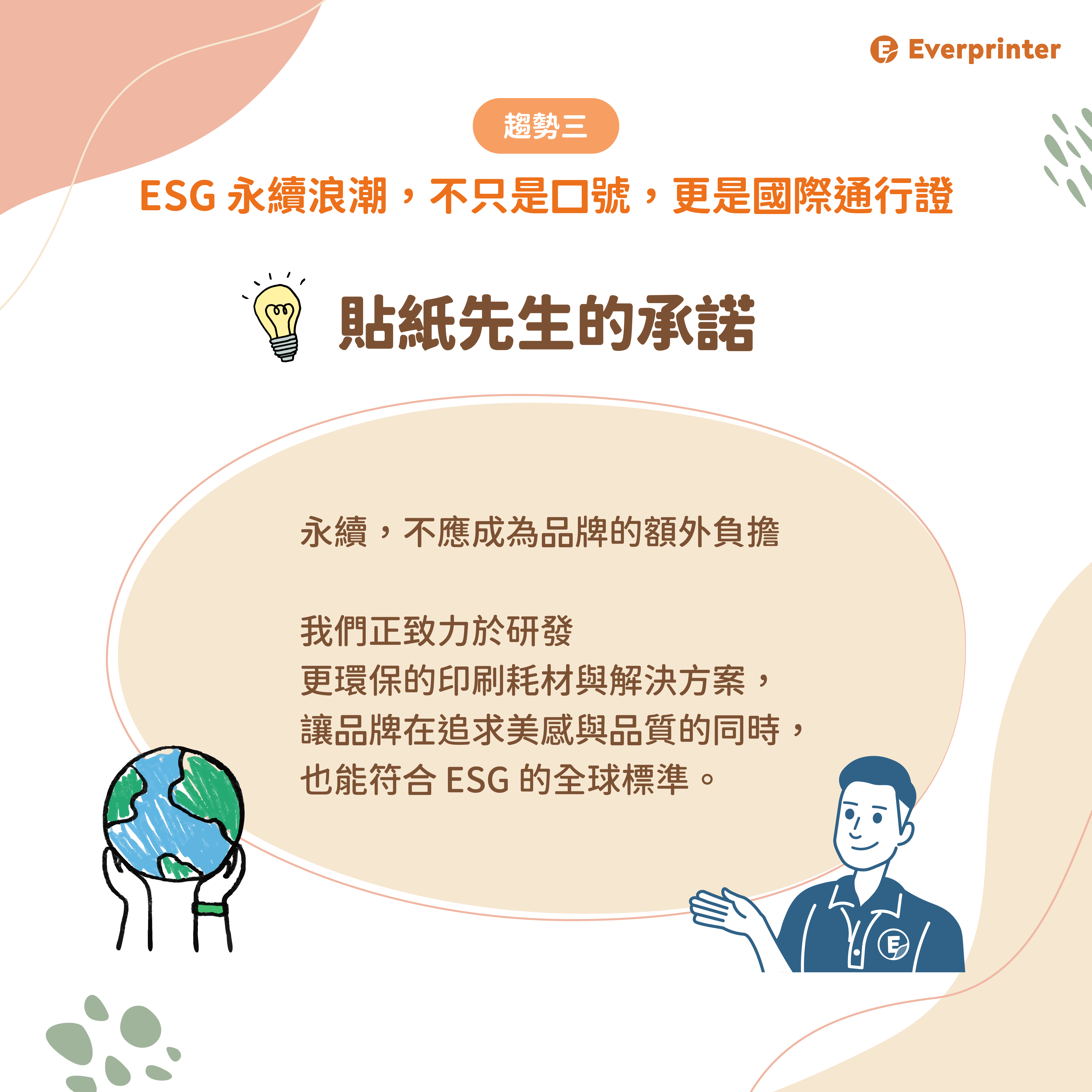貼紙先生的承諾: 永續不應增加品牌的負擔。我們正致力於研發更環保的印刷耗材,讓品牌在追求美感的同時,也能符合 ESG 全球標準。
