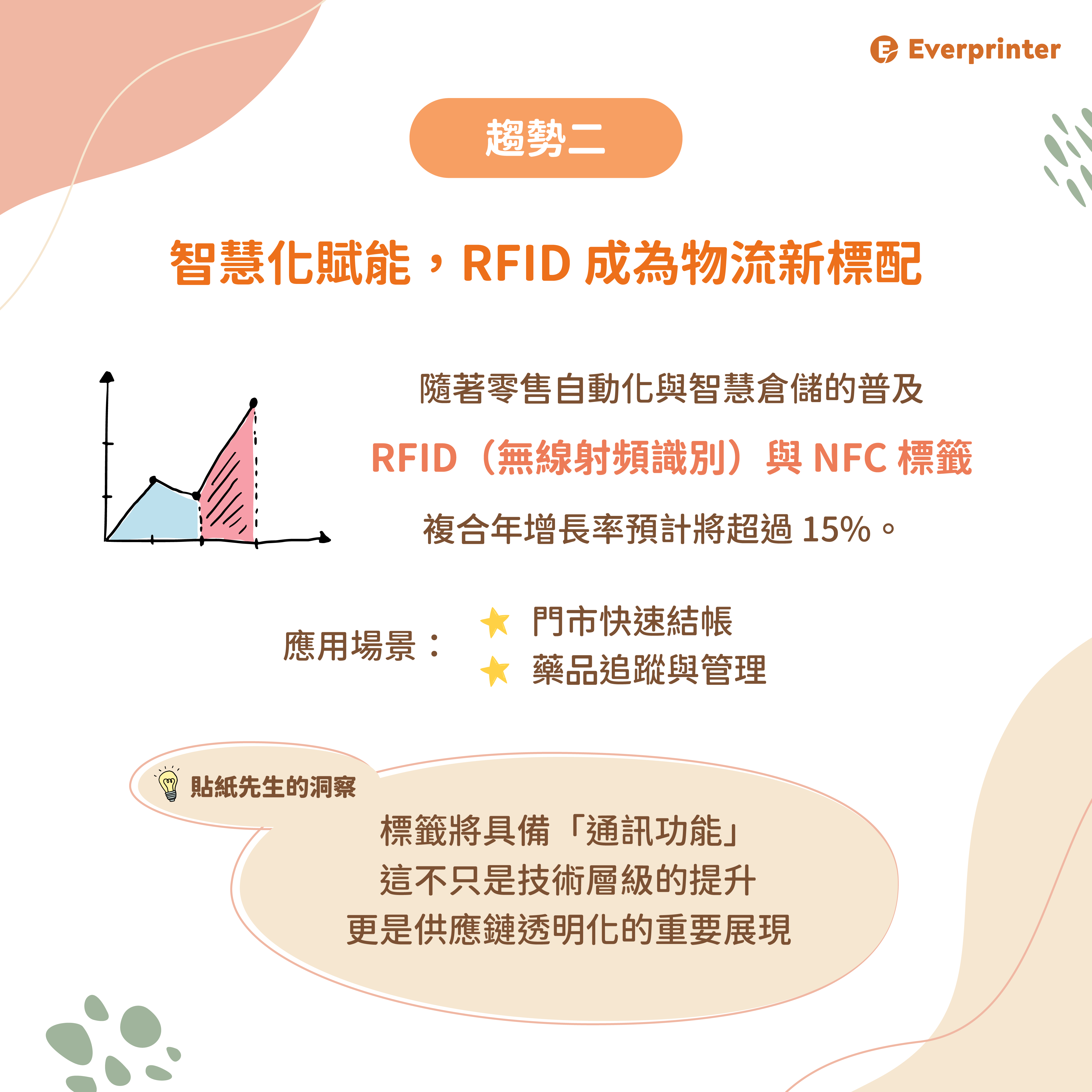 隨著零售自動化與智慧倉儲的普及,RFID(無線射頻識別)與 NFC 標籤 的複合增長率預計將超過 15%。