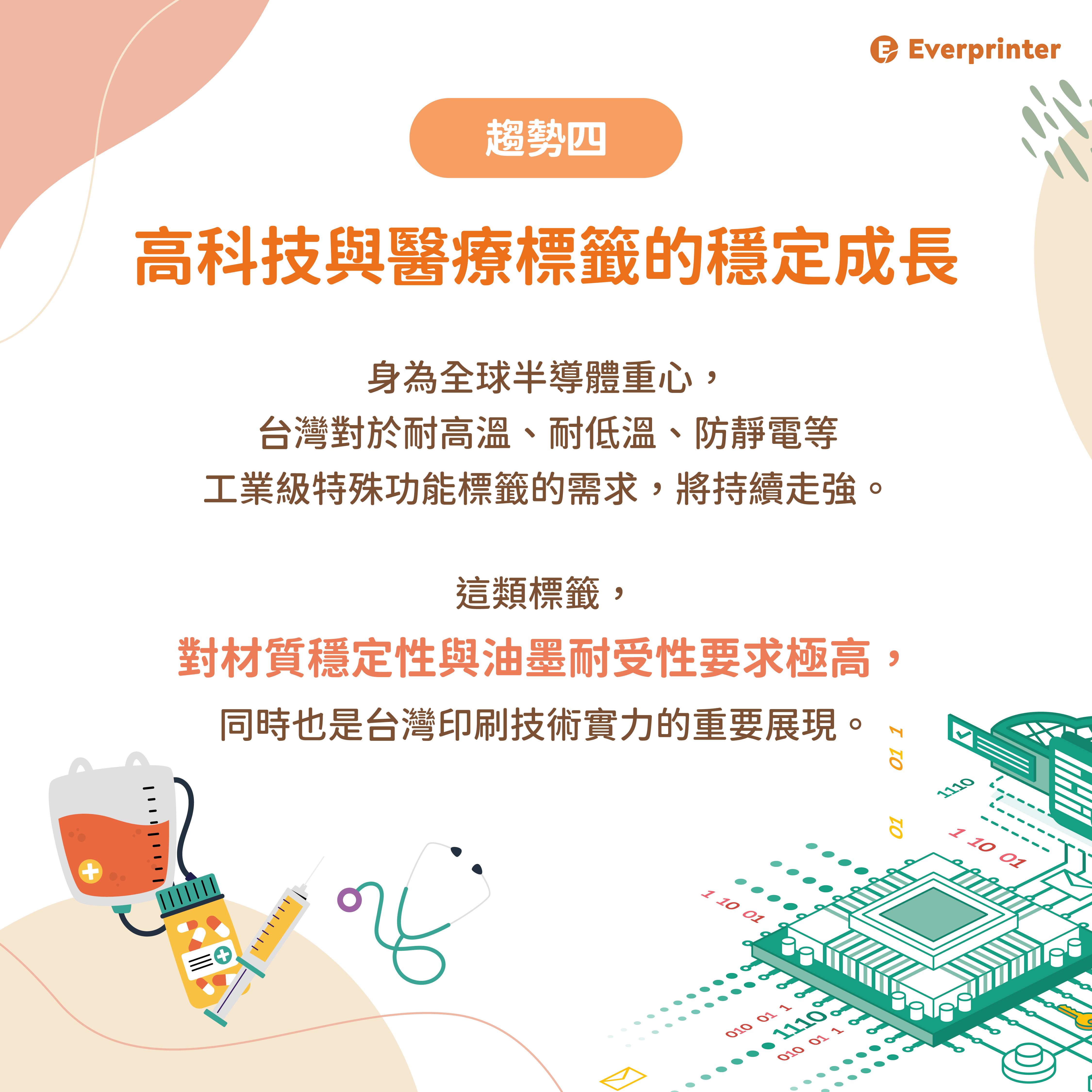 身為全球半導體重心,台灣對於耐高溫、耐低溫、防靜電等 工業級特殊功能標籤 的需求將持續走強。這類標籤對材質與油墨的穩定性要求極高,也是台灣印刷實力的展現。