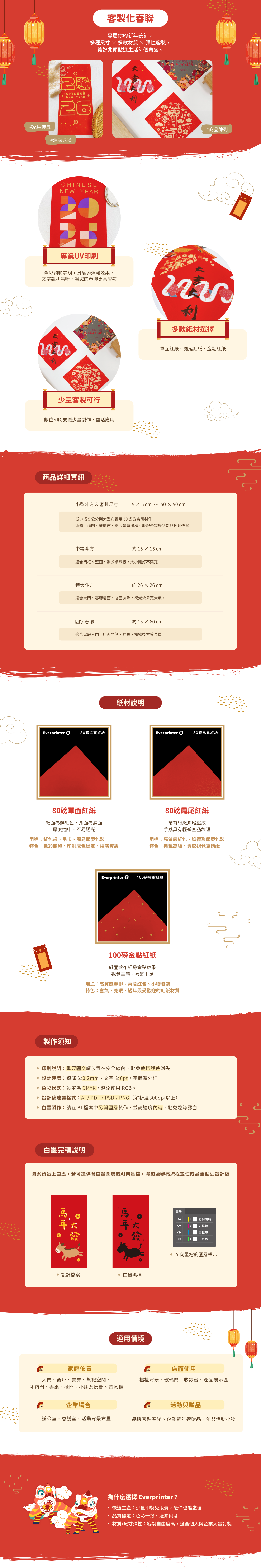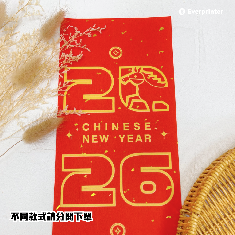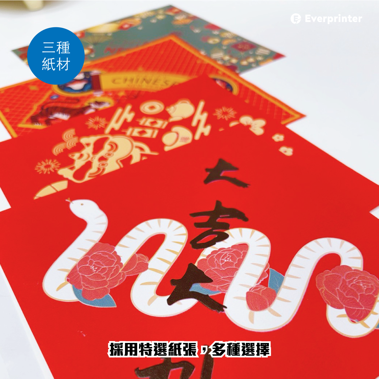 可線上編輯Everprinter 提供高品質客製化春聯印製服務,以專業 UV 數位印刷呈現高飽和色彩與精緻細節,完整展現您的品牌設計、插畫與祝福語。提供多款高級紅紙材質,包括經典書寫面紅紙、亮面紅紙與質感細膩的金點紅紙,滿足不同風格與需求。尺寸選擇彈性,從 5×5 cm 到 50×50 cm 皆可少量客製,另備有小型、中型、特大型斗方與四字春聯等標準規格,適用於企業送禮、門市布置、活動物資與商品加值包裝。用專業印刷與高質感材質,為您的品牌打造更具吸引力的新年形象,讓祝福更突出、曝光更有效。【UV墨呈現立體晶透浮雕感】【opp袋需另購】