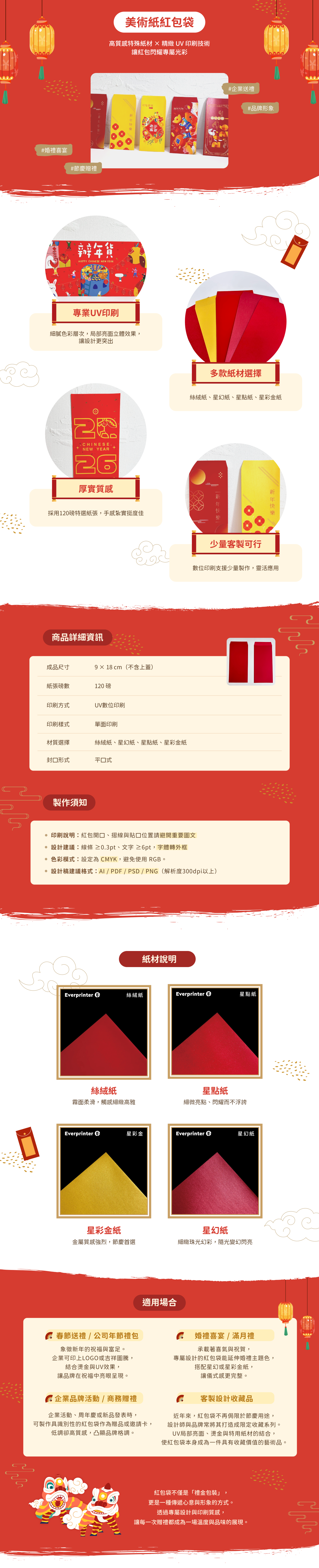 以高質感美術紙搭配專業 UV 印刷技術,打造專屬於您的紅包袋設計,讓每一份祝福更顯獨特與用心。無論是企業贈禮、品牌活動、婚禮喜宴或節慶禮包,我們皆能提供專業的印製服務。多款紙材可選,如絲絨紙、星點紙、星幻紙、星彩金紙等,觸感細膩、質感高雅。厚實的120磅紙材結構,搭配精準的印刷細節,呈現出細膩亮眼的層次感。最低少量即可製作,適合企業客製、品牌推廣或個人紀念收藏,讓紅包袋不僅是祝福,更是一份傳遞心意的藝術作品。【每10個紅包袋附贈一個自黏opp袋】【數量越多單價越划算!】