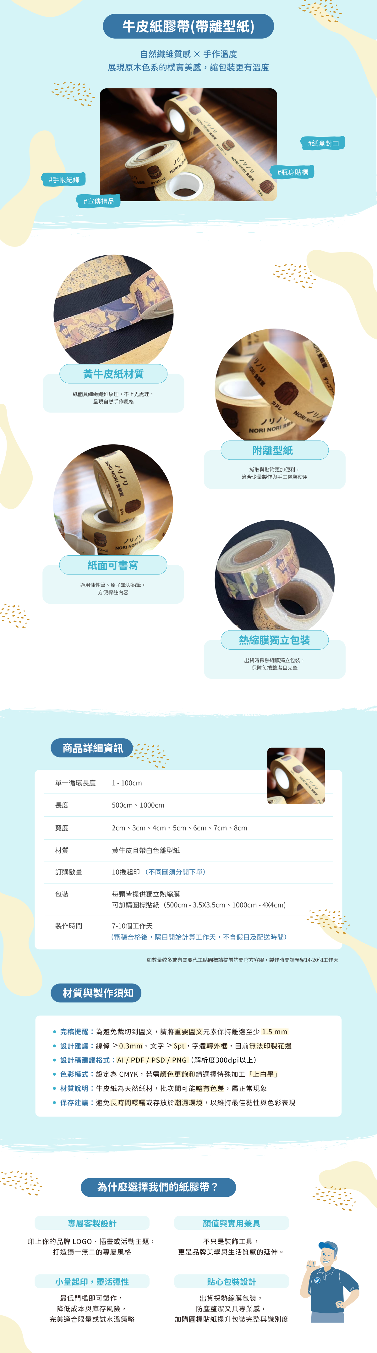 牛皮紙膠帶呈黃褐色,帶離型紙,為不上光材質,紙張有纖維感的紋路質感,文創質感整體大加分,除方便書寫外,也常用於瓶身及包裝產品上,台灣自有工廠製作,品質嚴格把關,最低10捲即可印製,使用熱縮膜包裝,價格超划算!