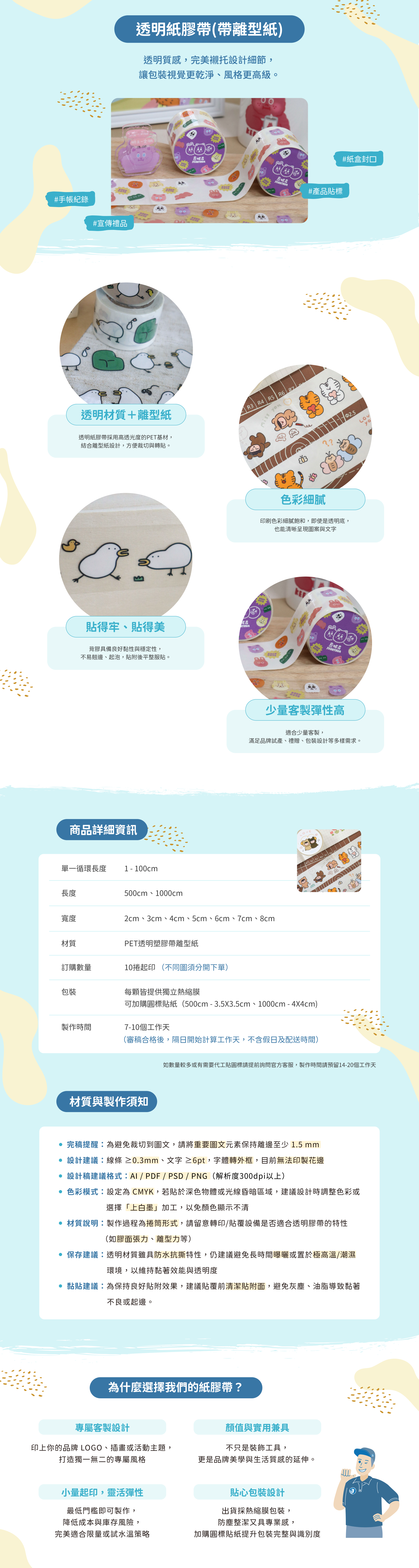 透明紙膠帶為PET塑膠材質,帶白色離型紙,防水抗撕耐曬,適用於透明瓶身或玻璃等。如需要貼在深色物體,建議在底圖加上白墨才不會被吃色。最低10捲即可印製,台灣自有工廠製作,品質嚴格把關,使用熱縮膜包裝,價格超划算!
