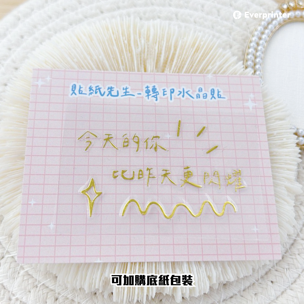 貼紙先生燙金/燙銀圖鑑轉印水晶貼,採用高透明水晶膠材質,結合精緻燙金與燙銀轉印工藝,呈現細緻金屬光澤與立體浮雕視覺效果,無需加熱或專業工具即可輕鬆轉印完成。此款轉印水晶貼可牢固貼附於玻璃、不鏽鋼、陶瓷、塑膠、木材、紙盒、保溫瓶、杯具、包裝盒與文創商品表面,貼合後邊緣服貼、不易翹起,兼具耐用度與高質感外觀。圖鑑系列設計風格多元,適合品牌標誌、文字裝飾、插畫圖案與客製化應用,廣泛應用於品牌包裝、禮贈品、手作創作、文具、生活用品與商業展示。貼紙先生提供多尺寸規格選擇,支援少量印刷與客製化設計,從設計到印刷一站完成,是追求高級質感、金屬效果與便利轉印體驗的燙金燙銀水晶貼印刷首選。【數量大於100張使用自訂數量】