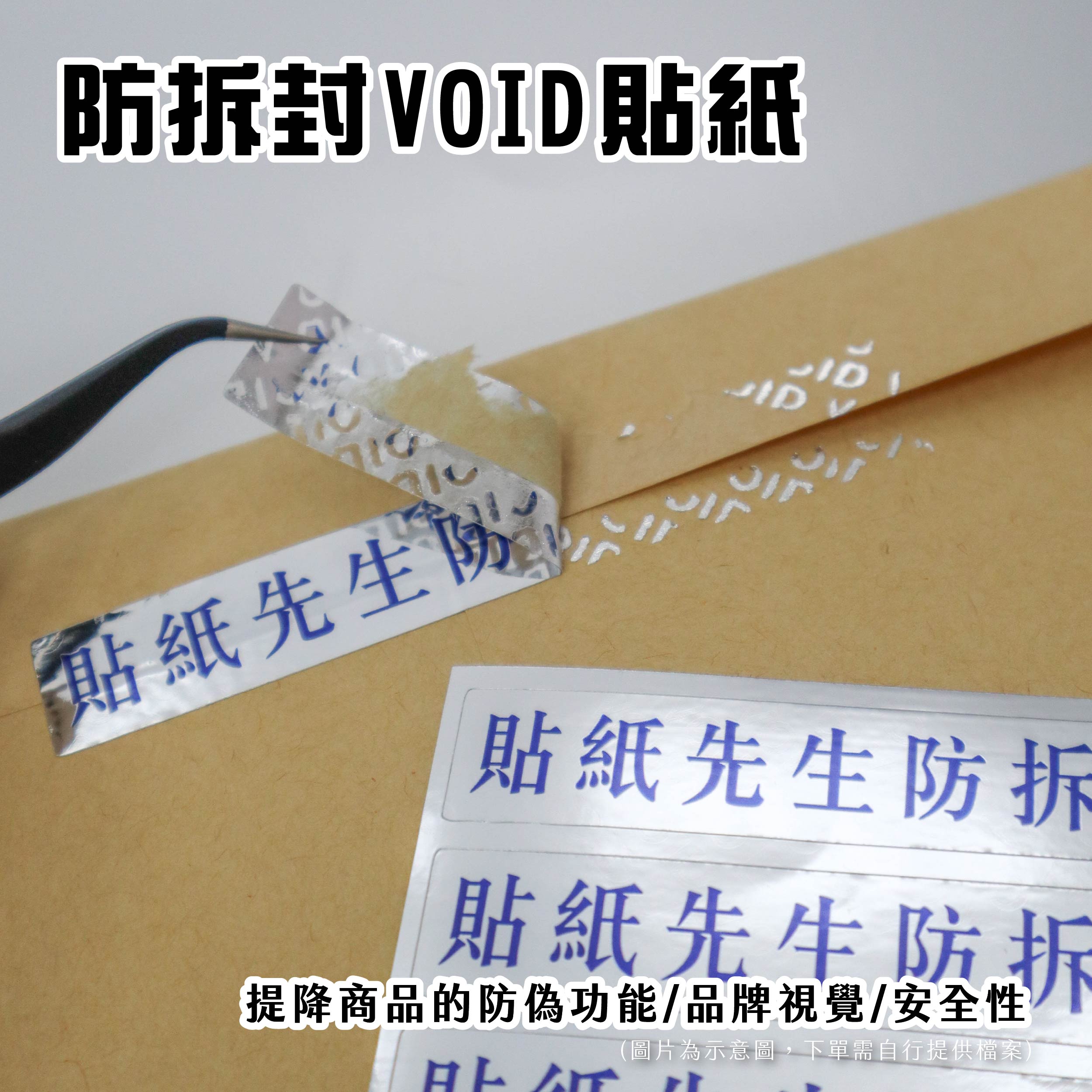 可線上編輯防拆封 VOID 貼紙採用高品質亮銀龍或白色特多龍材質,專為防拆、防篡改設計。貼紙一旦被撕開,表面將立即顯示「VOID」字樣,且部分貼紙殘留於產品表面,無法復原,有效防止未授權開封,保障商品安全與完整性。VOID 貼紙可採單色、彩色或白墨印刷,提升品牌識別度,亦可加入變動序號或條碼,強化防偽與追蹤功能。貼紙適用於各類高價值產品、電子用品、保健食品、化妝品及重要文件封裝,提供可靠的防拆保護。由台灣自有工廠生產,品質嚴格把關,支援多種尺寸與客製化印刷需求,並可搭配裁張或成捲交件,滿足不同應用場景。*年前最後出貨日為2/9,目前下單皆需於年後才能完成!*